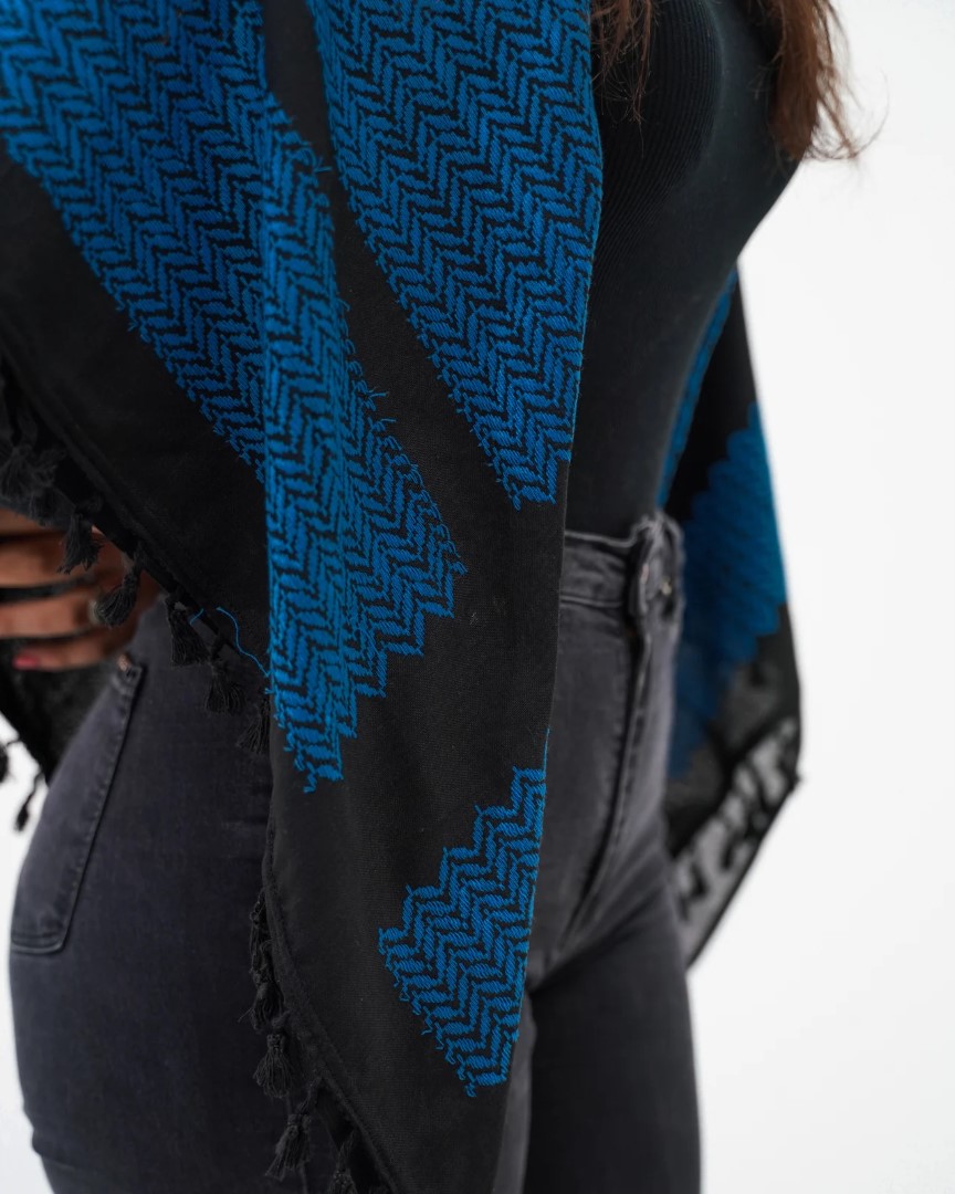 Our Yafa Hirbawi® Kufiya is a tribute to the majestic city of Yafa (Jaffa); a place known for its timeless beauty and deep history. The vibrant blue zigzag pattern on a rich black background captures the serene seaside and sweeping views of the Mediterranean coastline. This authentic Palestinian keffiyeh echoes the spirit of Yafa (يافا), meaning “beauty” in Canaanite, which was once the largest city in historic Palestine before the 1948 Nakba. Yafa is remembered as the great port city, famous for its citrus groves and the world-renowned Yafa Orange, and for its thriving community of banks, factories, and artisans. Although the city’s fortunes changed with the expulsion of nearly all its indigenous Palestinian population in 1948, Yafa still holds a special place in the hearts of Palestinians everywhere.